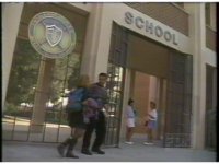 Angel Grove High entryway, talking couple head inside, passing the girls standing inside. |