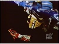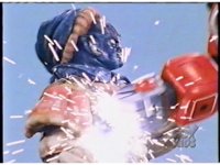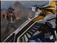 Close, side angle, on Marvo as the Red Ape fist of the Ninja MegaFalconzord sparkily bops him three times in a row, until he's knocked back. |