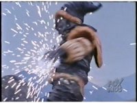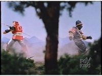 Against a multicolored backdrop, Ninja Megazord, in slow motion, punches the Red Ape fist into the screen, rapidly intercut with an image of the rabid Red Ape Ninja Spirit. |
