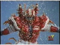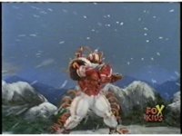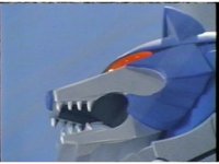 Against a backdrop of an implosion upon a sun, Ninjor throws his fists downward, zoom in on his face, as he turns to CGI, and his head folds backwards, causing another head to flip up from his chest emblem, and his sleeves pop up into shoulders. Pan down to his legs, as the thighs slide down to become boots. Now no longer CGI, Ninjor in Battle Mode poses each of his fists raised separately, as the implosion behind him reverses and explodes brightly. |