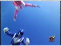 Black, Yellow, Pink, and Blue Rangers flip over camera. |