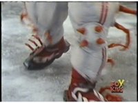 Distant side angle as Centiback and Ninjor race at one another, the monster leaping over his low sword slash. Ninjor turns around, slashes again, Centiback blocks, causing him to fall and roll, getting back up, and slashing once more, but the blade gets held by the monster. |