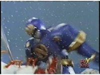 Ninjor is thrown across the snowy battlefield by Centiback's punt. |