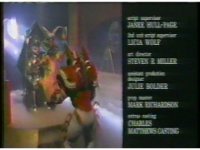 Against a multicolored backdrop, Ninja Megazord, in slow motion, punches the Red Ape fist into the screen, rapidly intercut with an image of the rabid Red Ape Ninja Spirit. |