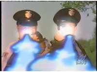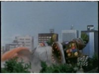 Against a multicolored backdrop, Ninja Megazord, in slow motion, punches the Red Ape fist into the screen, rapidly intercut with an image of the rabid Red Ape Ninja Spirit. |