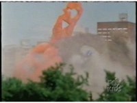 Face Stealer gets struck in the back by an orange blast, then again in the face, causing his body to shimmer with bluish-white energy rippling throughout, his pink energy-tongue whipping around, before he collapses, and explodes massively. |