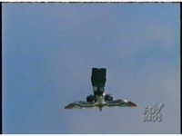 Close, side angle, as Ninja MegaFalconzord soars through the sky to our left. |