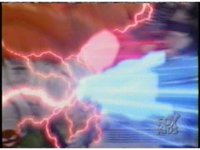 Close, side angle, on Face Stealer as both of Ninja MegaFalconzord's glowing fists strike him at once, causing a flash of energy that knocks him back. |