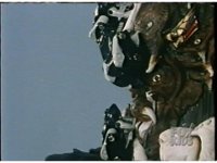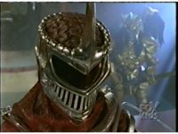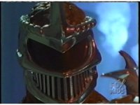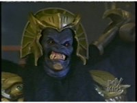 Slightly downward angle close-up of Lord Zedd on balcony, talking as camera lowers to level ground, as Goldar lurks in background the whole time. |