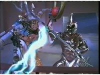 Track right, as Rita looks out from Repulsascope, to Zedd, crying, "Look at your bumbling beast, Zedd! We're losing!" He responds with close head-shaking, she replies, "Whatever! We've got to stop those power punks from winning!", gesturing forth over balcony. Zedd steps back, and both raise their respective staves, crossing them and firing flashing bolts of combined lightning energy forth. |