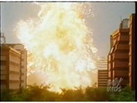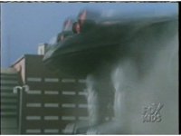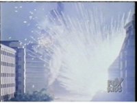 Distant shot, of Black Frog Ninjazord spewing a long steam of fire to our slight left, causing an explosion before it. |