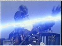 Pan left and up onto Hate Master as several bolts of energy sparkily blast into him from our lower right. |