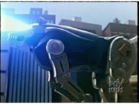 Side angle on Blue Wolf Ninjazord, firing blue beams from its eyes as it races along through the city to our left. |