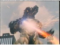 Hate Master gets struck with the flame stream, agonizing him before it cuts off and spark bursts explode around him. |