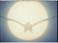White Falcon Ninjazord flaps its wings slowly, as it flies into the bright, white light of the sun. |