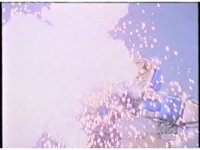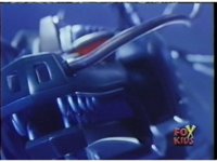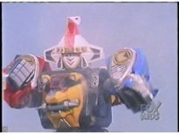 Against a multicolored backdrop, Ninja Megazord, in slow motion, punches the Blue Wolf fist into the screen, rapidly intercut with an image of the vicious Blue Wolf Ninja Spirit. |