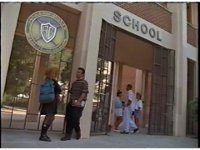 Slow pan right across the front entry gateway path of Angel Grove High School, as traffic passes at bottom of screen. |