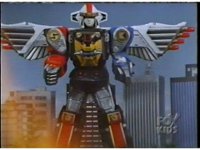 Ninja Megazord flies through the sky slowly. Zoom in on it as the White Falcon soars in and hovers above its back, causing a rapid flashing of light. |