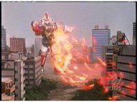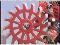 The flame-energized saw-blade rolls right into Ninja Megazord, causing it to spark burst. |