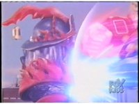 Against a multicolored backdrop, Ninja Megazord, in slow motion, punches the Red Ape fist into the screen, rapidly intercut with an image of the rabid Red Ape Ninja Spirit. |