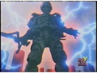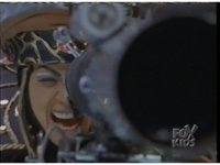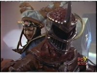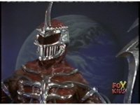 Close on Lord Zedd, leaning back then raising staff, moving his hand down it and gripping with both hands before turning again and jutting staff out into space, flashes appearing.. |
