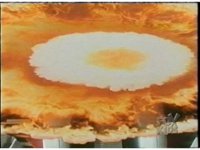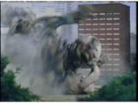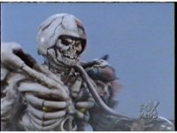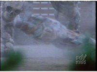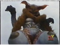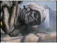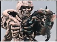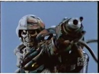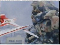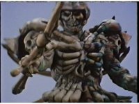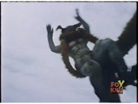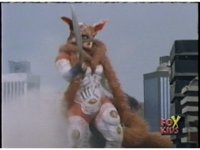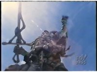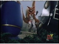 Against a multicolored backdrop, close on Ninja Megazord, pulling its right arm back, and in slow motion, punching the Red Ape fist into the screen, rapidly intercut with an image of the rabid Red Ape Ninja Spirit. |