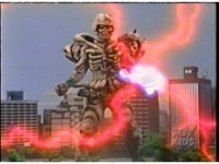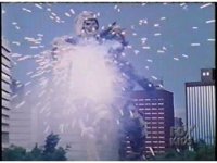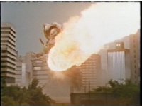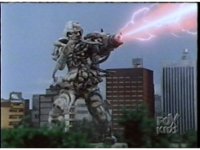 Continued, Ninja Megazord marches undeterred through the city as the third bright spark burst erupts around it. |