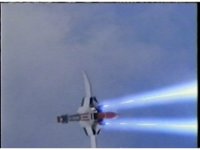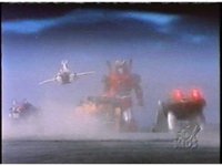 Ninja Megazord flies through the sky slowly. Zoom in on it as the White Falcon soars in and hovers above its back, causing a rapid flashing of light. |