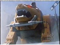 Extreme close-up of Yellow Bear Ninjazord's head, lifting it up as it roars. |