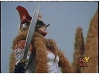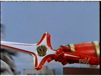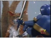 Repeat, new take, of Red Ape Ninjazord thrusting crossed blades into the screen. |