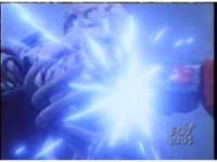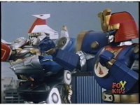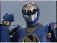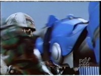 Against a multicolored backdrop, close on Ninja Megazord, pulling its left arm back, and in slow motion, punching the Blue Wolf fist into the screen, rapidly intercut with an image of the vicious Blue Wolf Ninja Spirit. |