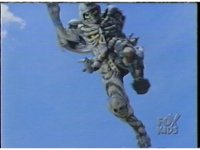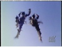Blue and Black Rangers leaps down through the blue sky, demorphing. |
