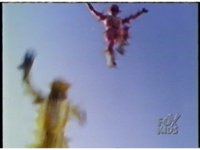 Yellow and Pink Rangers leap down through the blue sky, demorphing. |