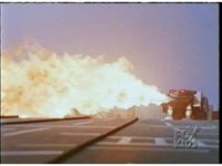 Ground level angle, of the smoking, destroyed flame thrower nozzle-arm sheath falling to the floor. |