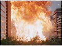 Katastrophe falls, rolls, gets back up, then limply collapses, erupting into a massive explosion in the city. |