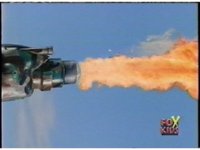 Distant shot, of Black Frog Ninjazord spewing a long steam of fire to our slight left, causing an explosion before it. |