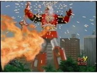 Repeat, closer on Ninja Megazord marching undeterred through the city as three bright spark bursts erupt around it. |