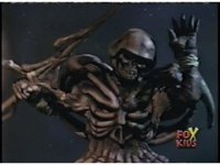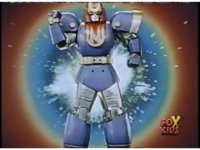 Close on Ninjor's CGI face, and his head folds backwards, causing another head to flip up from his chest emblem, and his sleeves pop up into shoulders. Pan down to his legs, as the thighs slide down to become boots. Zoom out, as the CGI ends, and Ninjor in Battle Mode poses each of his fists raised separately. |