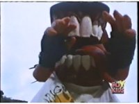 Close on Ravenator as the flames cut across him, causing him to flare and shimmer, zoom out between Shogun Megazord's legs as the monster spins around, collapses, and explodes massively. |