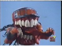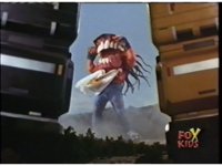 Close-up on Shogun Megazord's Saber, as a blade of flames spews out from the fish's fanged mouth. |