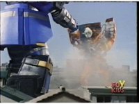 Upward shot of Brick Bully being thrown high over Blue Shogunzord's head. |