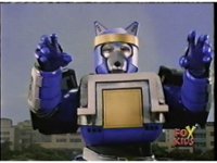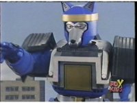 After its golden chest symbol flashes with power, zoom out from the Blue Shogunzord, as it does its wolfish poses. |