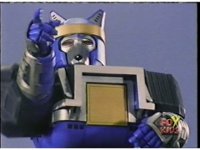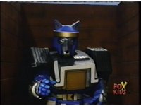 Zoom out from Wolf Coin symbol on back wall, as Blue Ranger appears in his Zord's cockpit, crossing arms, then holding out right arm, nod-talking as he does. |