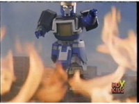The flames of the raging fire cover the screen, but soon quell, revealing the Blue Shogunzord, standing in the near distance, undamaged and posed. |