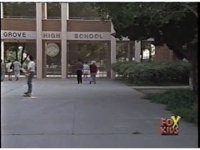 Side angle, camera pans left as blonde walks into Youth Center, just as a pair of teens exits. |