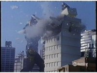 Blue Globbor slaps through a cheap gray cardboard building, causing it to burst apart completely into a shower of dust and debris. |