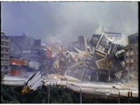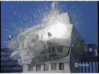 Repeat, close on cheap gray cardboard building, as it bursts apart completely into a shower of dust and debris. |