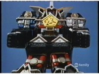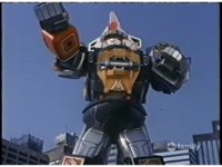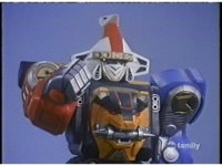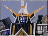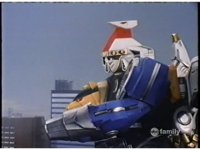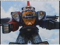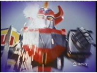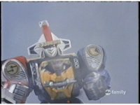 Downward pull out from Shogun Megazord, towering over us, as the Zord energies crackle into the chest symbol. |