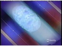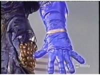 Close-up of Blue Globbor's left hand and forearm, as it glows blue, changes to its larger form in an outline of gold, then again changes to that matching the design of Ninjor. |