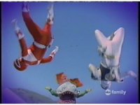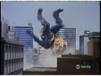 Yellow and Black Rangers fall from the sky, kicking their feet and grabbing at the air. |